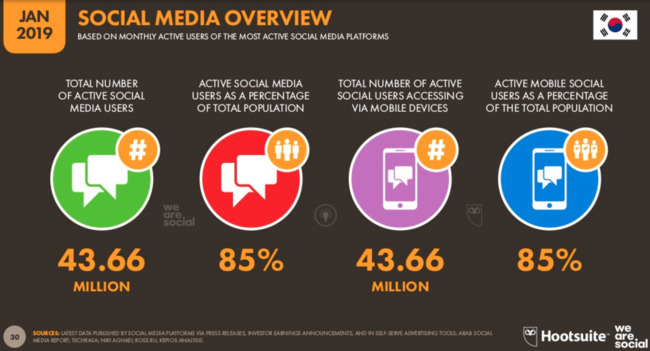 - There are 43.66 million Korean people using social media or 85% of the total population.